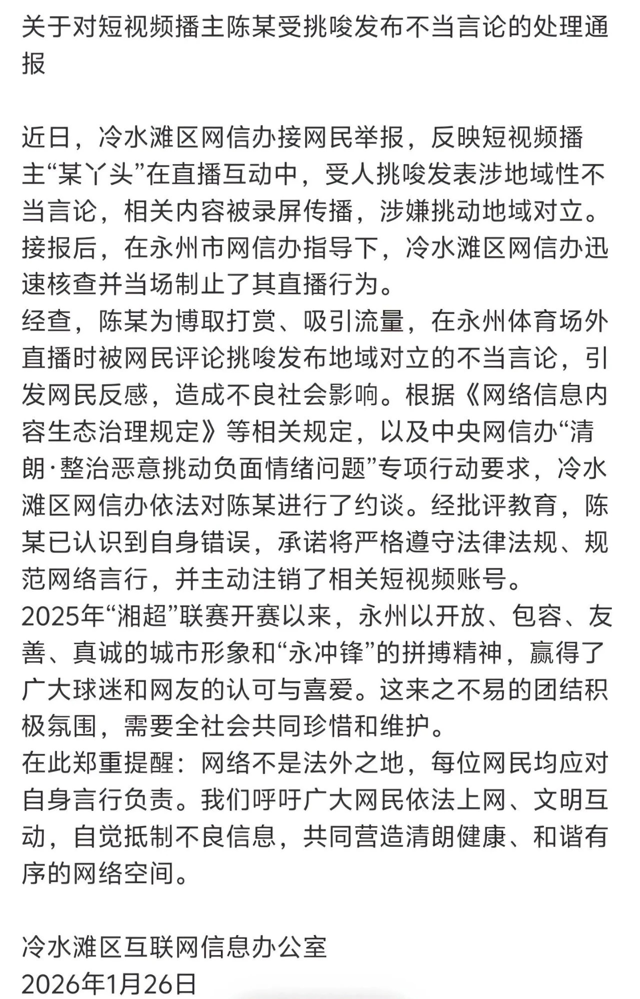 通报称,近日冷水滩区网信办接到网民举报,反映陈某在直播互动时,被他人挑唆发表了涉地域性不当言论。相关内容被录屏传播后,涉嫌挑动地域对立,引发网民反感与关注。