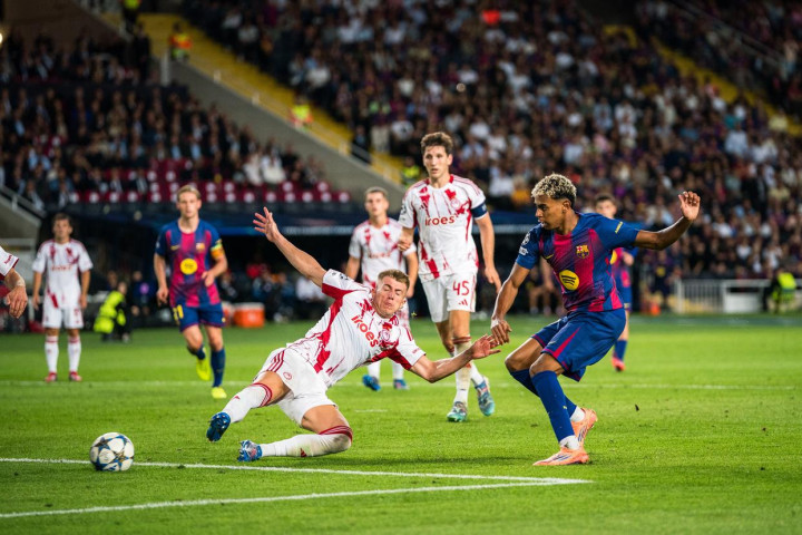 10月21日,巴塞罗那队球员亚马尔(右一)在比赛中射门。新华社发(胡安·戈萨摄)