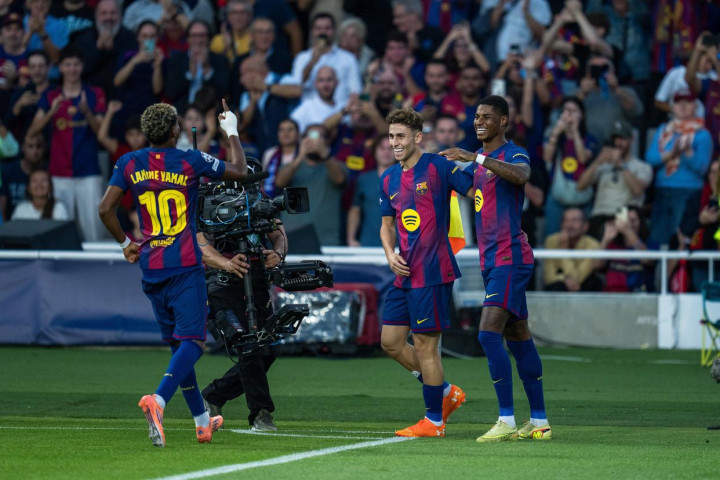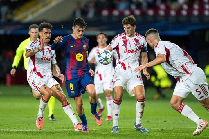 10月21日专业配资炒股网,巴塞罗那队球员佩德里(左二)在比赛中进攻。当日,在2025-2026赛季欧冠联赛阶段第三轮比赛中,西甲巴塞罗那队主场6比1战胜希腊奥林匹亚科斯队。新华社发(胡安·戈萨摄)